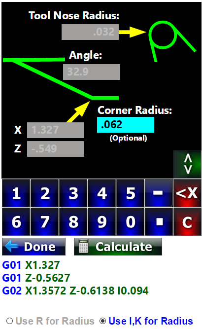Quickly and easily Calculate the G-Code needed to program CNC Lathes to Accurately Turn Angles with Fillet and Corner Radii. This is just one of the many calculators included in the Web Machinist Mobile Pro APP. Read More: Web Machinist Mobile Pro® has many calculators for CNC Machinists, Programmers and QC Inspectors. Including Calculators for Angles, CNC Applications, Simple Lathe Cam CNC Lathe Tool Nose Compensation G-Code Calculators, Chamfer G-Code Calculators, Metric Conversions, Countersink Depth Calculators, Center Drill Depth Calculators, General Conversions, CNC Drilling, CNC Mill & Lathe Deep Hole Drilling calculators, Blueprint Symbols, G Codes, M Codes, Machining Formulas and calculators, Spindle speed and feed rate formulas and calculators, circle solving formulas, Hole Patterns, Hole Array Patters including full circle and partial circle patterns, 3 Wire Threads Pitch Diameter Measuring Calculators for Unified Threads, Metric Threads, Acme Threads and Metric Trapezoidal Threads, CNC Lathe Tool Nose Radius compensation calculators, QC Inspection, Manual Machining, Metal Removal Rates, CNC Milling, Reference, Rotary Axis, Speeds & Feeds, Imperial and Module Spur Gear Dimensions Calculators, CNC Tapping, CNC Threading, Manual Lathe Calculators, Unified Threads, Metric Threads, Acme Threads, Metric Trapezoidal Threads, Spur Gears, Module Spur Gears, Imperial Spur Gears, Area Calculators, Triangles, Circle Calculators, Mill Machine Tooling, Collets dimensions, Keyseat Cutters Calculators, Trigonometry Calculators, Hole Pattern Calculators, Wheel Bolt Pattern Calculators, Manual Mill Calculators, Tooling & Hardware, Sine Bar and Compound Sine Plate calculators, Trigonometry & Geometry, Shop Math Calculators, Lathe Spindle Speed Calculators, CNC Tapping Speeds Calculators, Drilling Speeds Calculators, Tapping Speeds Calculators, CNC Turning and Miscellaneous Calculators. This is a Must Have APP for Machinists, CNC Machinists, Machine Shops, QC Inspectors, CNC Set-up Operators, CNC Programmers.