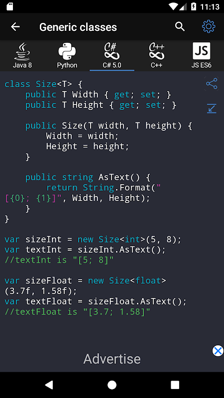 Estos y más de 300 ejemplos de otros códigos para cada idioma están disponibles en la aplicación.