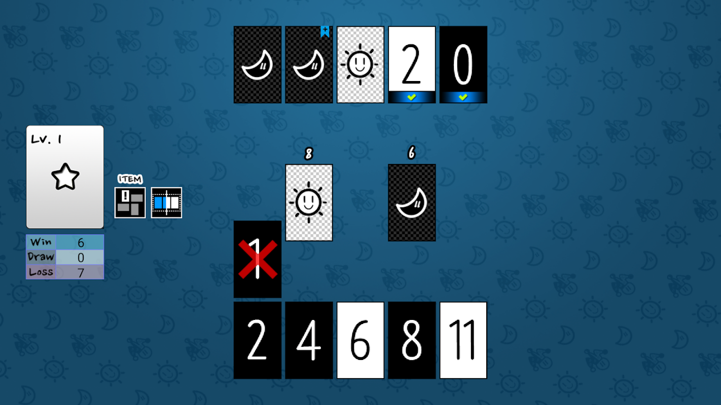 Se utilizan 24 cartas (negras 0~11, blancas 0~11) en el modo normal y 26 cartas incluyen el comodín en el modo comodín. En primer lugar, eliges 4 cartas y puedes sacar una carta del mazo de cartas y adivinar el número eligiendo una carta de tu oponente en tus turnos. Si aciertas, puedes adivinar los números en sucesión o pasar el turno al oponente. Si te equivocas, debes revelar la última carta traída y el turno pasa a la otra parte.