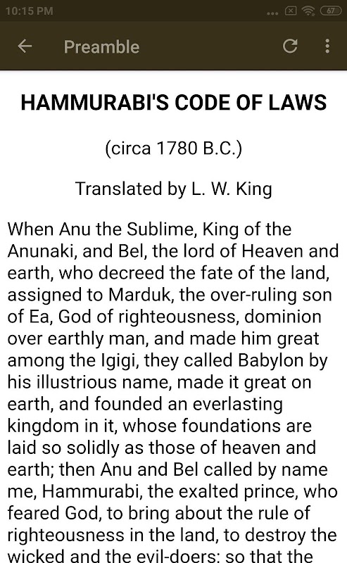 Esta aplicación presenta el Código de Hammurabi traducido por L. W. King.