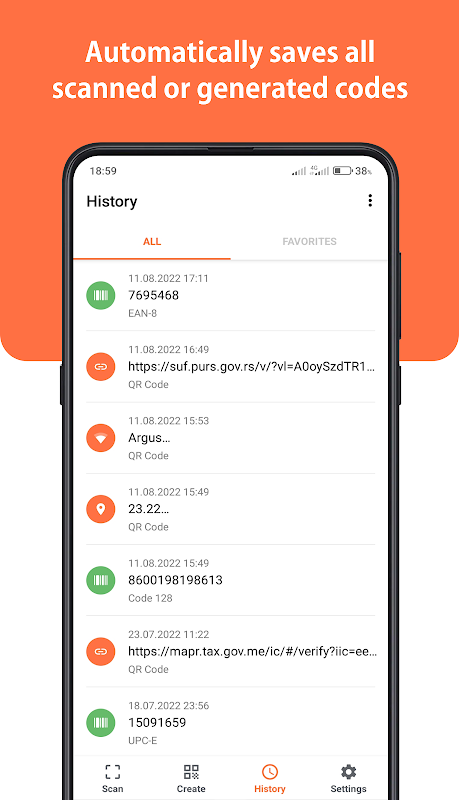 Todos sus códigos escaneados o generados se guardan automáticamente en el historial desde donde luego puede acceder a ellos y administrarlos. El historial le brinda la posibilidad de reabrir o reutilizar el contenido del código que ya ha utilizado. Puede administrar el historial, eliminar códigos (individualmente o todos) o compartir su contenido escaneado con otros.