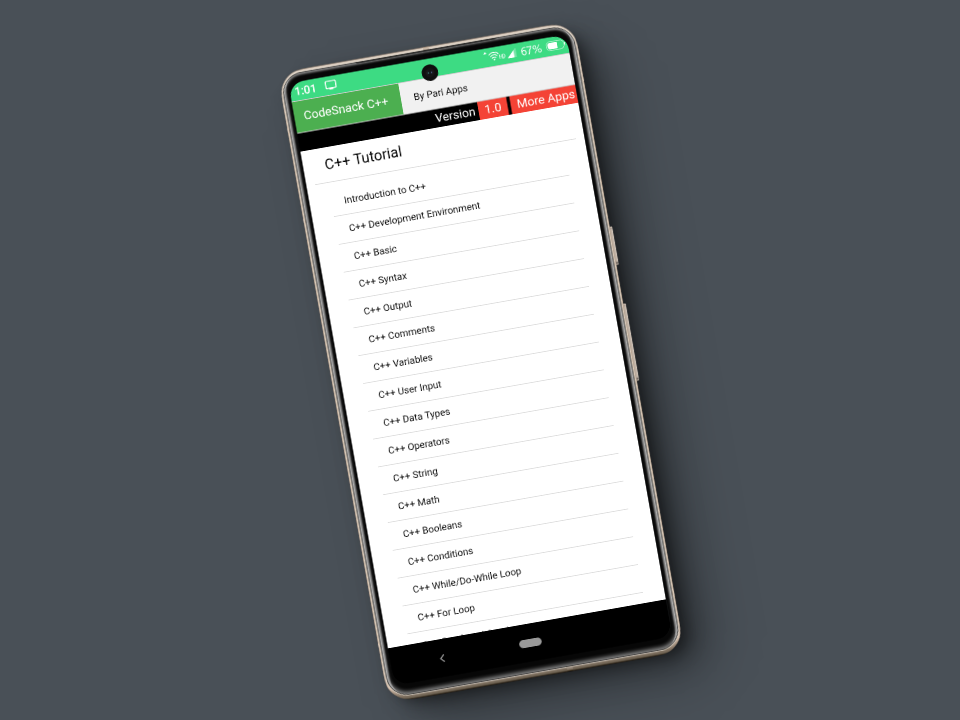 Bienvenido a "CodeSnack C++", donde comienza su viaje hacia el dominio del lenguaje de programación C++. Ya sea que sea un principiante en codificación o esté buscando mejorar sus habilidades, esta aplicación está diseñada para ser su compañera de referencia para convertirse en un desarrollador competente de C++.