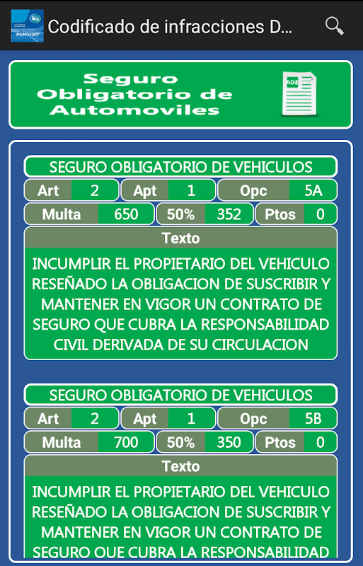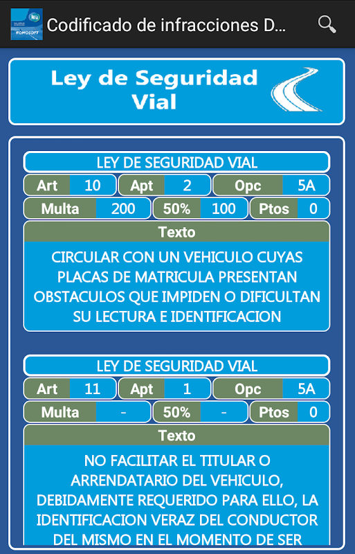 Guia codificada de infracciones DGT. Contiene las reformas mas importantes de la Ley de Seguridad Vial. Real Decreto Legislativo 6/2015, de 30 de octubre, por el que se aprueba el texto refundido de la Ley sobre Tráfico, Circulación de Vehículos a Motor y Seguridad Vial. Esta aplicación permite consultar las infracciones de tráfico publicadas en la guia codificada de infracciones editada por la Direccion General de Tráfico. Permite asignar las infracciones más usuales o habituales en favoritos. Además utliza los mismos colores para las infracciones de las distintas leyes y reglamentos para que le sea mas fácil utilizar a los usuarios familiarizados con la guia.