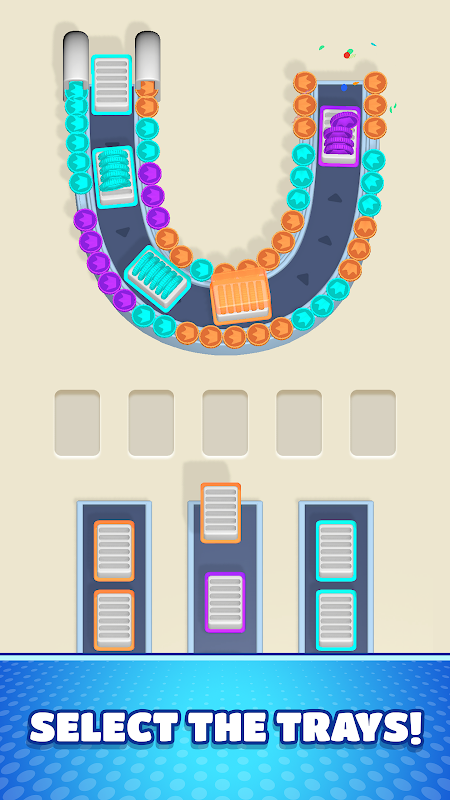 En esencia, Coin Stack Jam gira en torno a un sistema de clasificación muy intuitivo pero progresivamente complejo. Los jugadores comienzan tocando para elegir las bandejas que saltan a una cinta circular giratoria. Esta sencilla acción crea posibilidades sorprendentemente complejas. Cada moneda tiene un color diferente, y cuando las monedas del mismo color se encuentran con las bandejas, saltan automáticamente a las bandejas con una animación y un sonido satisfactorios. El objetivo es llenar la Bandeja Activa designada sin llenar los compartimentos.