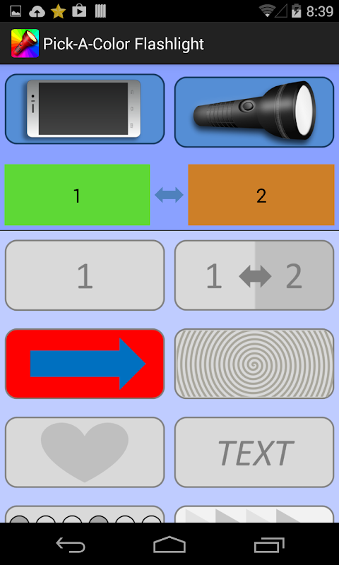 En todos los dispositivos, la Linterna de Color convierte su pantalla en una linterna de colores. Utilice el selector de color para elegir dos colores, que serán usados para iluminar la pantalla.