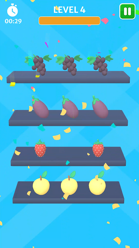 Intente ordenar los elementos de colores en la base hasta que todos los elementos de colores estén en la misma fila. Coloque el elemento de color de una fila a otra fila para completar el nivel.