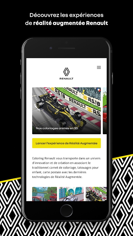 Coloring Renault te transporta a un mundo de innovación y creación asociando colores, postales y tatuajes tradicionales con las últimas tecnologías de Realidad Aumentada. Da vida a modelos de Renault como el EZGO, Kadjar, Kangoo, RS18 o incluso el Zoe.