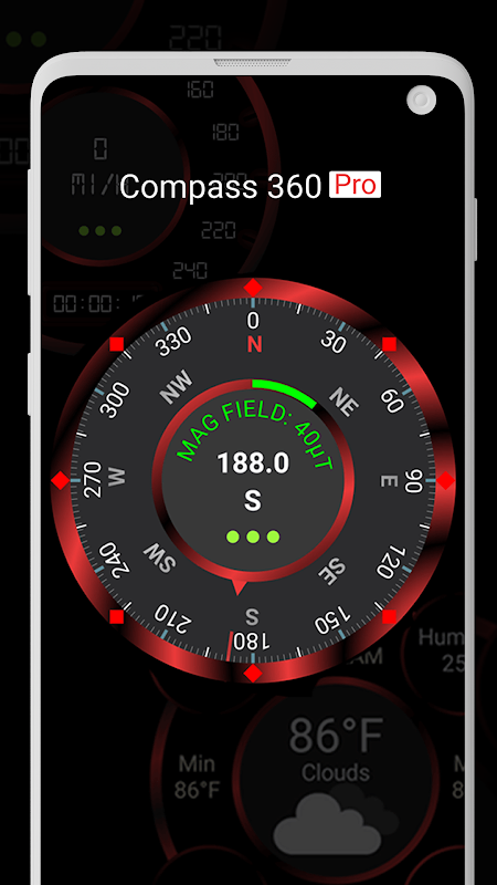 Utilice la brújula para determinar su orientación en diversas condiciones exteriores. Ideal para practicar senderismo, acampar y viajar, Compass 360 Pro le brinda acceso a datos de campos magnéticos del norte, sur, este y oeste. No se requiere conexión a Internet; simplemente úselo como una brújula real, en cualquier momento y en cualquier lugar.