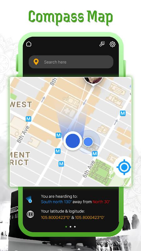 🕌 Qibla direction con vista de mapa: Visualiza en directo la mecca direction desde tu ubicación actual.