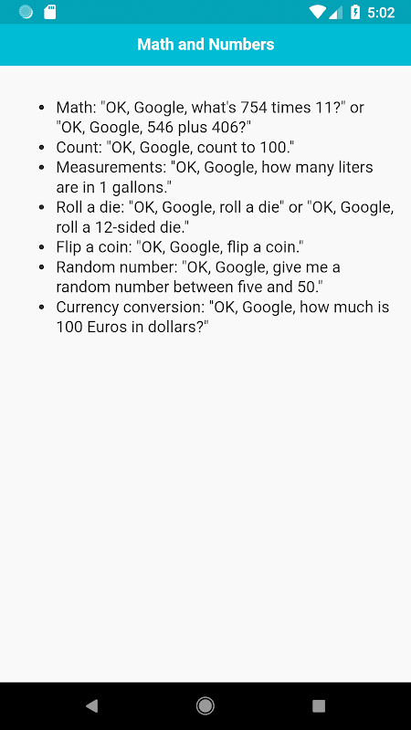 You can ask it many questions and tell it to do things. Just start with "Ok Google" or "Hey Google" to get answers from Google, manage your day, book your flight, set alarm, enjoy your entertainment, and control your smart home. When you ask for help, it can tell your voice from others for a more personalized experience. Google Home Mini works on its own or you can have a few around the house, giving you the power of Google anywhere. From this app, you will able to learn essential commands you can use with Home Mini. Enjoy!