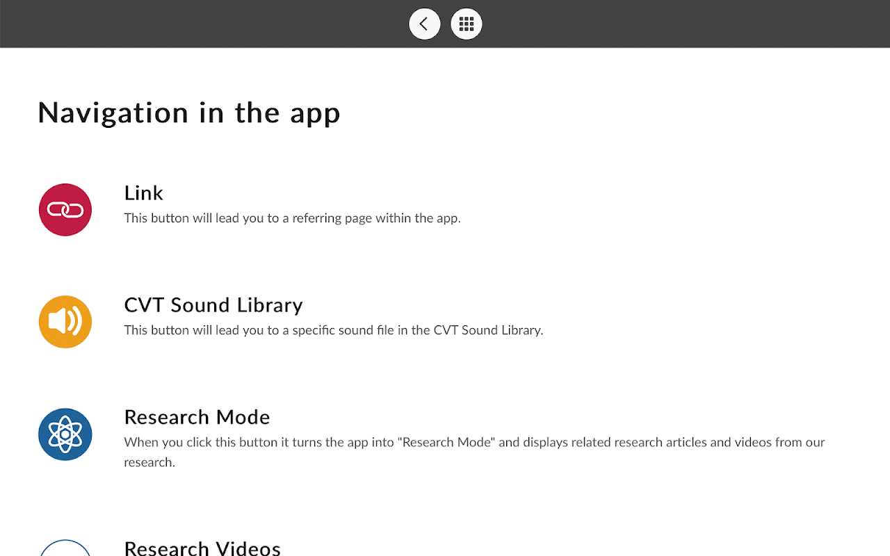 The CVT app represents ground breaking approaches within vocal pedagogy, and helps professional as well as amateur singers reach new potential and solve problems in their voices. The app covers techniques for all styles of music, how to control the four vocal modes, speech techniques, mastering the various vocal effects - training all sounds in a healthy way. The app lets you unlock the sounds YOU want in your own voice with simple tools, visuals, and training tips, as well as offering in-depth descriptions of anatomy, physiology, and science.