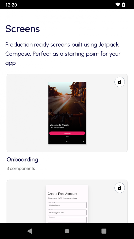 Más de 100 componentes y pantallas Jetpack Compose diseñados profesionalmente para hacer realidad tus ideas rápidamente.