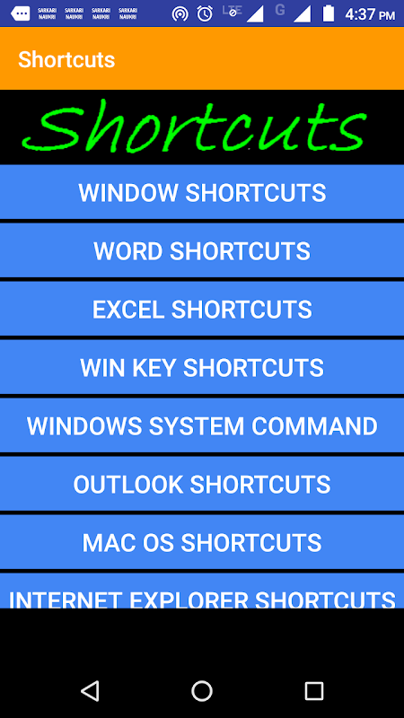 User of this apps can easily know shortcut key of Microsoft window, Microsoft word, Microsoft excel , Win Key Shortcuts, window system commands, Outlook shortcuts, MAC OS shortcut key, internet explorer shortcut key , google chrome shortcut key for MAC os or Windows, Firefox shortcut key for MAC or Windows operating system and also contain shortcut key of tally erp9.