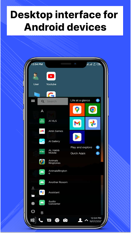 Computer Launcher: Win 10 es una aplicación de inicio de escritorio que transforma su teléfono Android en una computadora de escritorio. Este iniciador de ventanas le brinda una experiencia familiar similar a la de Windows 10 con íconos, menús y una barra de tareas. También puedes usar el teclado y el mouse de tu teléfono para controlar tus aplicaciones y archivos con este iniciador de Win 10.