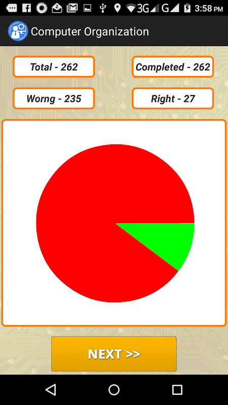 Al final de la sesión, muestra los resultados con un gráfico de tarta. Puede compartir este resultado con tus amigos. Si desea obtener más información sobre el tema, la aplicación también tiene tutoriales GRATIS. Se trata de una completa herramienta que te prepara para el examen de Organización del ordenador.