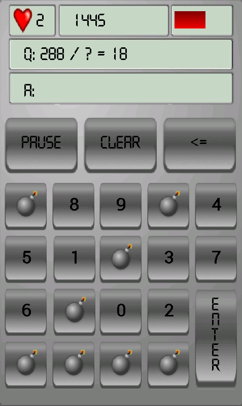 The buttons keep switching places, faster and faster, making them harder to press them in time. There is a timer that speeds up with each right answer, making each question more daunting than the last. There are bomb buttons that switch with the numbers, avoid them at all cost.
