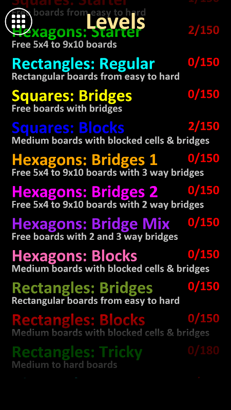 El juego regular le permite seleccionar el paquete de rompecabezas, la elección de una forma de hexágono, cuadrado, rectángulo, diamante o del Pentágono, y si se debe incluir puentes en los puzzles o no.