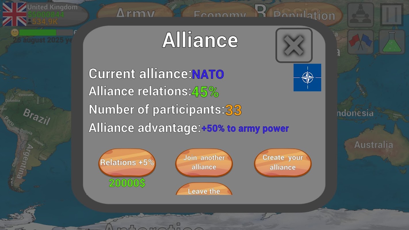 Conquer The World is a game about colonization and conquest of other countries. You can choose any country and improve its economy, buy upgrades for your army, research new methods of combat. Random events sometimes occur in the game that need to be resolved, the population of your country can call riots and rallies from which you need to defend yourself. You can also choose the ideology of your country, increase the growth of the country's population, change taxes and much more! The game is often updated and will not let you get bored