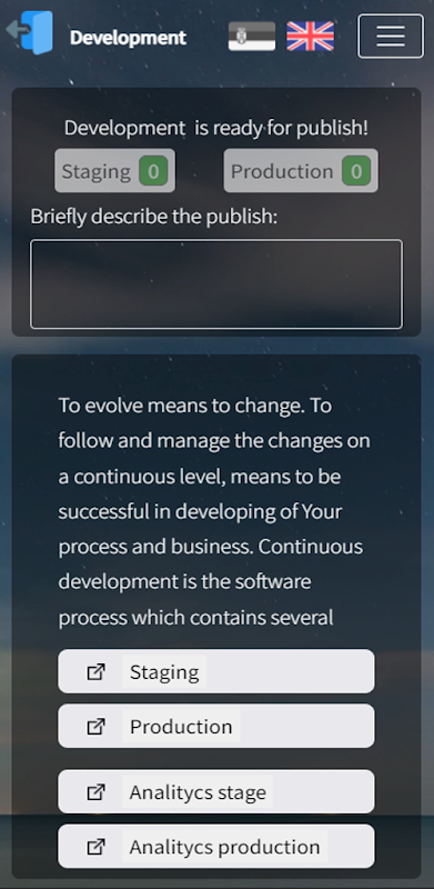 With continuous development, every change of Your code is available right after the publishing, which means great saving in time. By using this platform Your team can provide, safe, reliable and high-quality product in time.