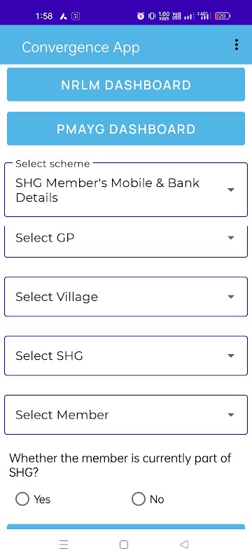 La aplicación Convergence registra los detalles de la encuesta de los beneficiarios de PMAYG sobre la inclusión de ellos mismos o de sus familiares en los SHG.