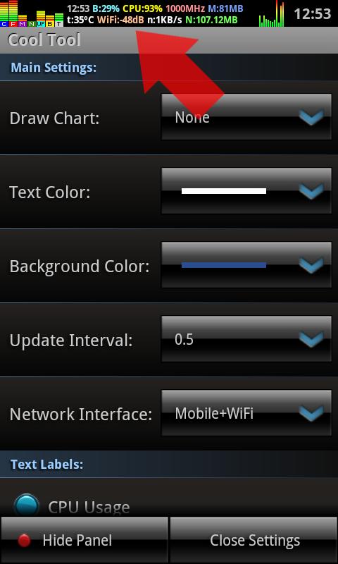Toneladas de medidores podrían agotar la batería muy rápidamente. Desmarca las funciones que no necesitas. Por cierto, Cool Tool se fue a dormir y no dibuja nada cuando la pantalla se apaga. Es para ahorrar energía.