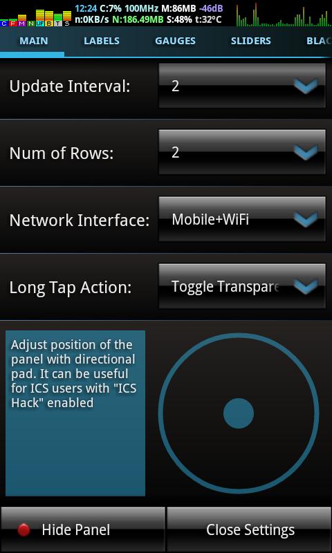 Presione el botón Mostrar panel para habilitar el tablero. Puede arrastrar una ventana flotante sobre la pantalla o tocar dos veces para abrir la configuración. Ver video y capturas de pantalla para más detalles.