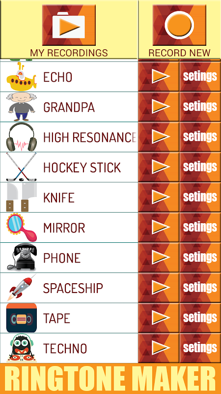 Esta aplicación incluye dos efectos agradables y útiles - puede reducir o añadir eco a su voz, o aplicar un uno de los quince efecto, el cambio de la voz de acuerdo a sus preferencias. Todos los sonidos se pueden establecer como tonos de llamada o asignar a los contactos. Además, todos los sonidos en la aplicación se pueden establecer como tonos de SMS o sonidos de alarma y temporizador. Modificar, cambiar y disfrazar su voz en cualquier aplicación o juego que utiliza un micrófono para añadir otra dimensión de la creatividad. Se puede engañar fácilmente a sus amigos hablando con ellos con una voz diferente cada día. De niña a extranjero, las opciones de cambio de voz son ilimitadas. Voz disfrazar el anonimato por la radio o internet.