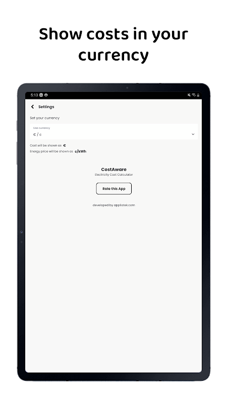 CostAware is a quick and simple electricity cost calculator for calculating electric costs of using home appliances and others. Your list of appliances will be stored on the app and you can quickly check usage cost according to todays electricity unit price (kWh).