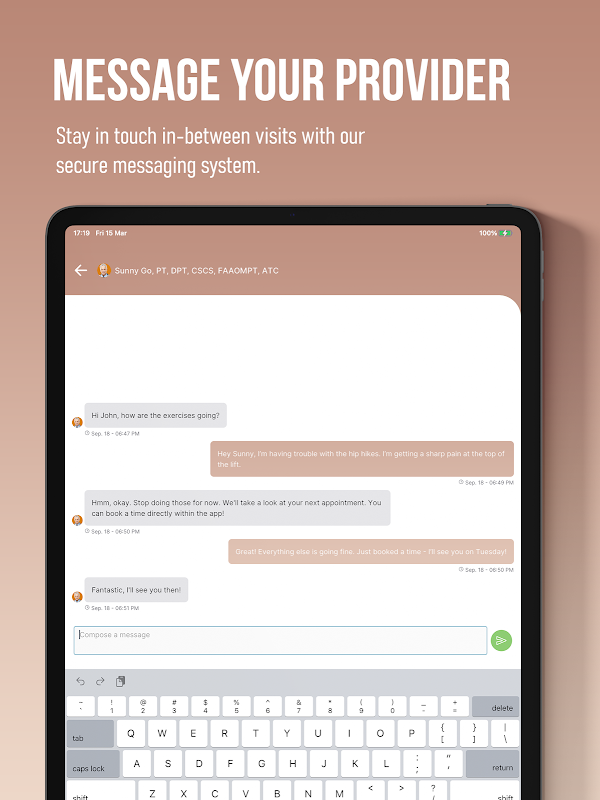 Con esta app, puedes acceder a tu Programa de Ejercicios en Casa personalizado con videos instructivos en HD. En la pestaña "Mensajes", puedes comunicarte de forma segura con tu proveedor del Programa de Ejercicios en Casa CPT. ¡A medida que completes tus ejercicios, te entregaremos trofeos y medallas para celebrar tu progreso!