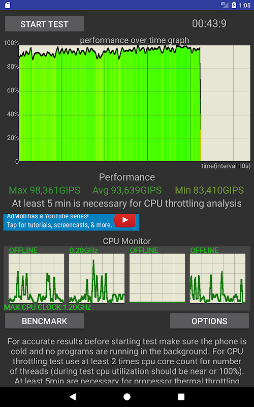 Aplicación cargas CPU con hasta 100 hilos y las medidas de rendimiento. Si el teléfono puede manejar refrigeración de la CPU (la mayoría puede no) el rendimiento se mantendrá constante, pero si no puede CPU comenzará a acelerador y la velocidad disminuye.