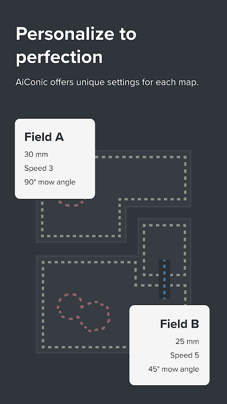 3. Cortar: una vez conectado, AiConic comienza a cortar el césped de inmediato, con control total sobre todas las configuraciones, así como la capacidad de ajustar las áreas, zonas y caminos de corte en cualquier momento.