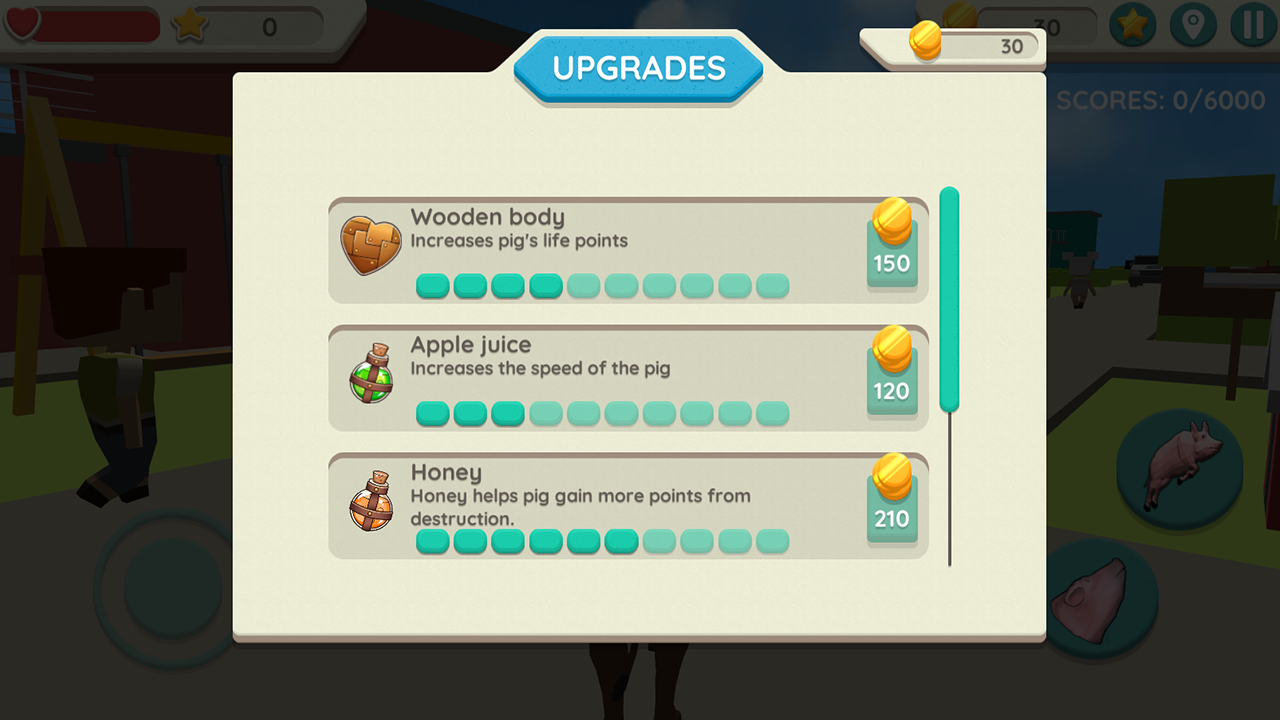 ✅ ¡Mejora al cerdo! Puedes mejorar los puntos de vida, la velocidad del cerdo, la cantidad de puntos obtenidos y el tiempo de vuelo del jetpack.