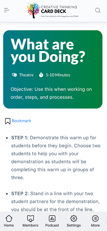 Cada rutina de calentamiento, estrategia o pensamiento creativo ofrece un conjunto de pasos para que su uso sea lo más simple posible. También tiene la opción de marcar sus favoritos, para que pueda volver fácilmente a los que más disfrutan sus alumnos.