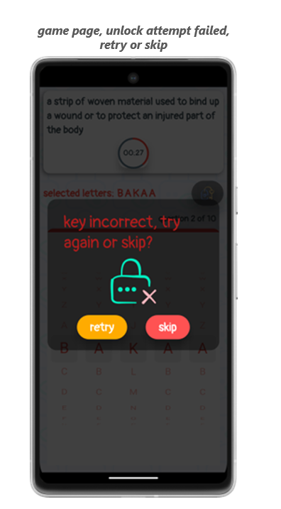 Una vez configurados los selectores de letras, pulsa el botón de desbloqueo para comprobar si has acertado. Si has escrito mal la palabra, podrás volver a intentarlo o pasar a la siguiente definición.