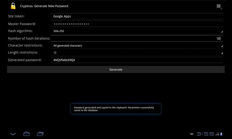 Cryptnos is a multi-platform, Open Source application for generating strong, pseudo-random passwords using cryptographic hashes. It combines a unique "site token" such as a website domain name with a master password and runs this data through a cryptographic hash algorithm to produce a password that is unique, lengthy, seemingly random yet completely repeatable. Unlike similar products, however, it is exceedingly flexible. It is not a browser plugin, so it can be used with other applications outside the Web. It provides unparalleled versatility by letting you specify the cryptographic hash to use, how many iterations of the hash to perform, what characters to include, and how long the final password should be. Best of all, it is exceedingly secure. Your master and generated passwords are *NEVER* stored, and the parameters to recreate your passwords are stored using strong AES-256 encryption.
