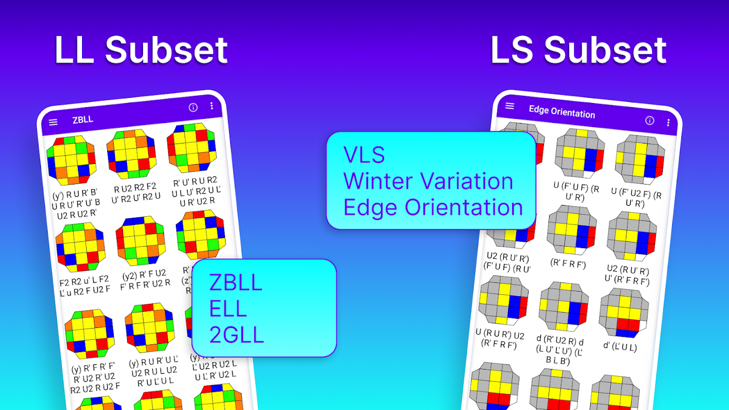 F2L, OLL, OLLCP, COLL, ELL, ZBLL, VHLS (EO), VLS, PLL, 2-Look OLL and PLL. Every step has specific information on how it affects and how algorithms should be treated. The Solve Cube tool has everything you need!