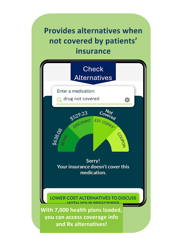Finalmente, una aplicación que elimina el misterio de los costos y ahorros de los medicamentos al navegar automáticamente por todas las opciones en tiempo real para encontrar los costos "de bolsillo" más bajos por medicamento. En cuestión de segundos, la aplicación tiene en cuenta la información de su seguro, el copago estimado, los descuentos disponibles y las comparaciones con los precios "en efectivo" de múltiples socios líderes de tarjetas de descuento para ofrecer el precio de bolsillo más bajo disponible. Si un medicamento no está cubierto por quienes tienen seguro, la aplicación también mostrará medicamentos alternativos a un costo menor para discutir con su proveedor de atención médica.