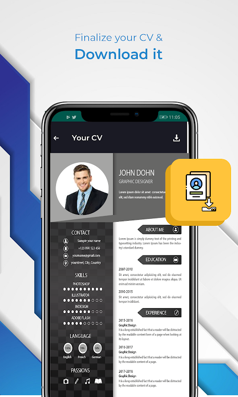 Puede descargar el CV en formato PDF. Esta aplicación funciona sin conexión y en línea, puede imprimir currículum. Puede enviar el currículum por correo electrónico y compartirlo.