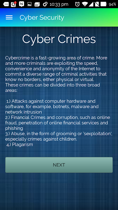 Hoy en día Delitos Cibernéticos son como la piratería, el robo de identidad, etc se becomming más y más común. Para sensibilizar a la gente sobre estos crímenes, que estamos lanzando la App Seguridad Cibernética. Seguridad Cibernética App es una aplicación de información que ayuda a la gente a entender por qué la seguridad cibernética es importante.
