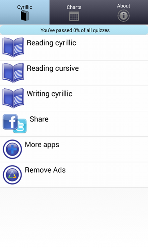 Cyrillic teaches you the history and usage of the Russian Alphabet letting you learn Cyrillic at your own pace using easy-to-navigate lessons, quizzes, and flashcards.