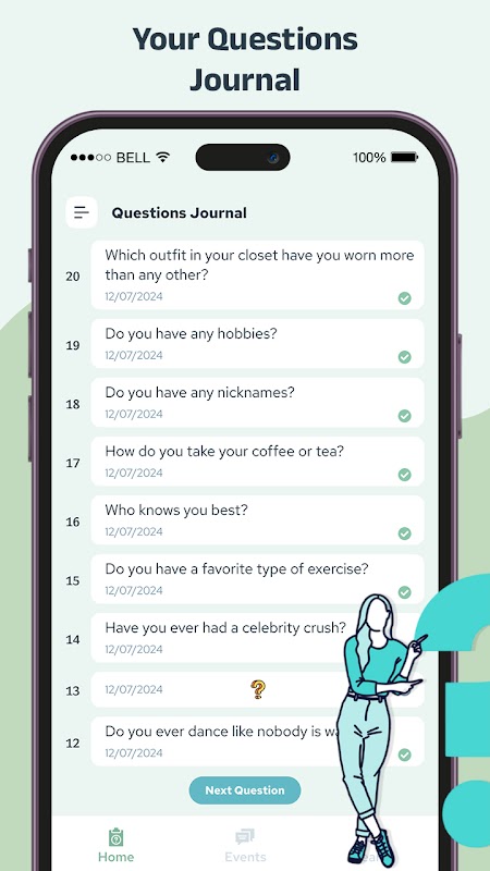 •Preguntas Diarias: Cada día recibirás una nueva pregunta como "¿Qué tal tu día?". Puedes responderla o ignorarla si lo prefieres. Un año después, se te volverá a presentar la misma pregunta, lo que te permitirá reflexionar sobre cómo han evolucionado tus pensamientos y sentimientos con el tiempo.