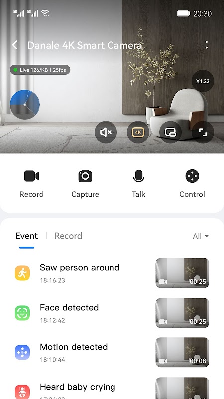 Úselo junto con su cámara inteligente Danale para visualizar secuencias de video valiosas para usted. Los datos de vídeo no se pueden cargar en la nube, lo que garantiza la seguridad. Un análisis más detallado del contenido de vídeo en su teléfono lo clasifica para facilitar su visualización. Puedes conectarte a la cámara en cualquier momento a través de la aplicación para ver imágenes en tiempo real y grabaciones locales.