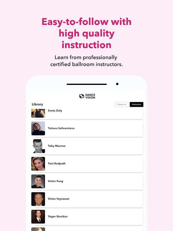 Dance Vision Syllabus es el programa de estudios de baile de salón número uno en su teléfono, tableta o televisor inteligente. Úsalo para aprender a bailar paso a paso, al ritmo que más te convenga.