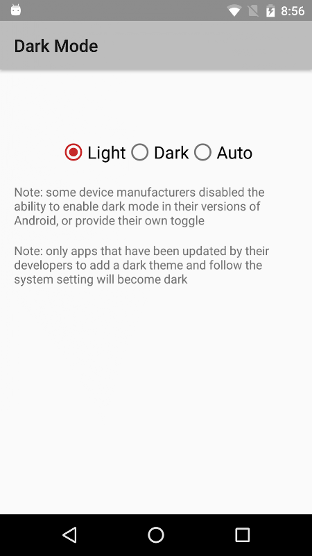 Utility app which uses built-in APIs to activate dark mode system-wide, which will change the theme for apps which have been updated by their developers to have an automatic dark theme, even on older devices! Unlike many others, it is completely open source and will never show any ads.