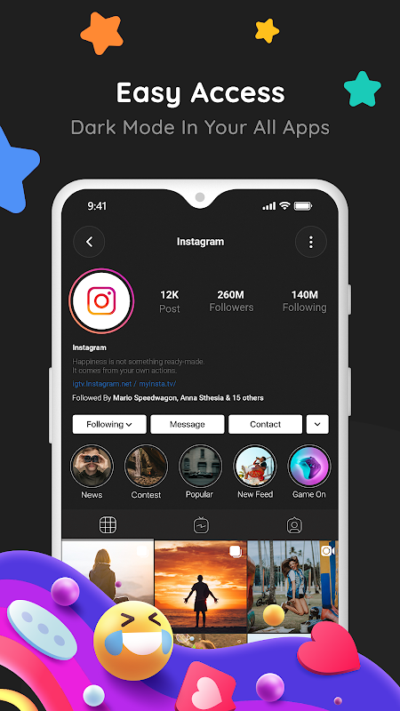 You are hooked scrolling on to the Instagram feed endlessly for hours and it puts a lot of strain on your eyes if your phone does not have the night mode or the dark theme installed. We can help you with that by changing the app’s bright colors to dark colors and a pleasant experience. Unlock the dark mode on your android device easily by a single tap of a button.