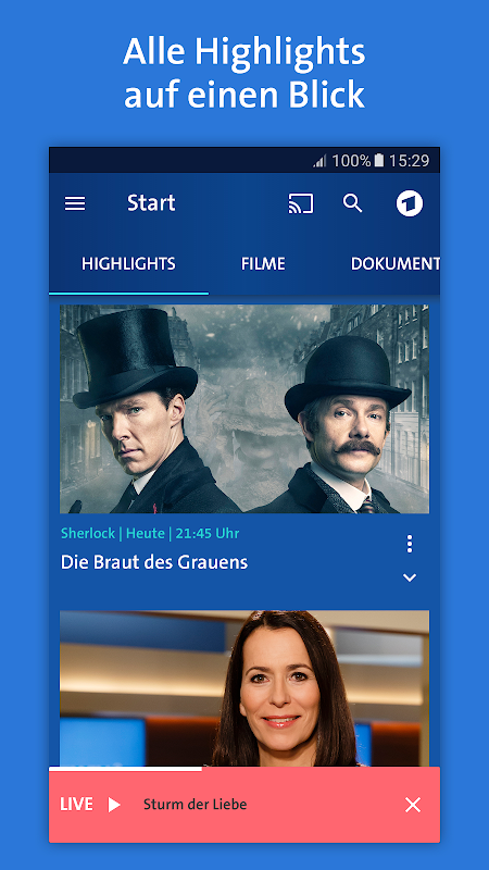 Mit der neuen Das Erste App kommen Sie noch leichter an Ihre Lieblingssendungen und Videos. Der neue Programmkalender vereint Programmvorschau, Livestream und Videos zu vergangenen Sendungen auf einen Blick. Redaktionelle Highlights und persönliche Empfehlungen finden Sie geordnet und übersichtlich auf der Startseite. Videos finden Sie schnell und leicht über den Programmkalender, über ein A-Z und über Rubriken wie Dokumentationen, Filme, Krimis, Nachrichten, Kinder, Ratgeber oder Kultur und Wissen.