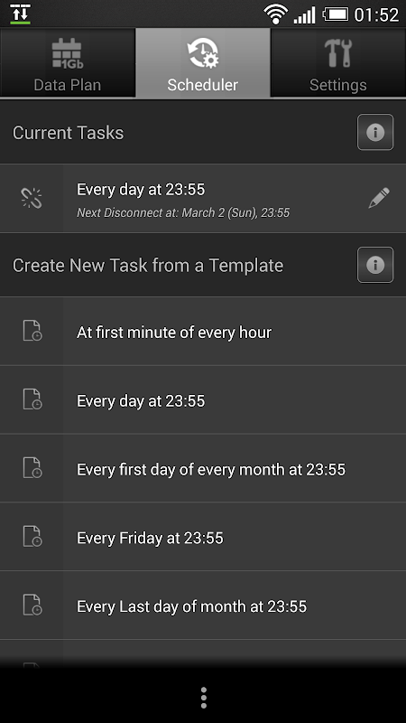 - Scheduled tasks that allow to turn on/off Mobile Data at certain times or dates