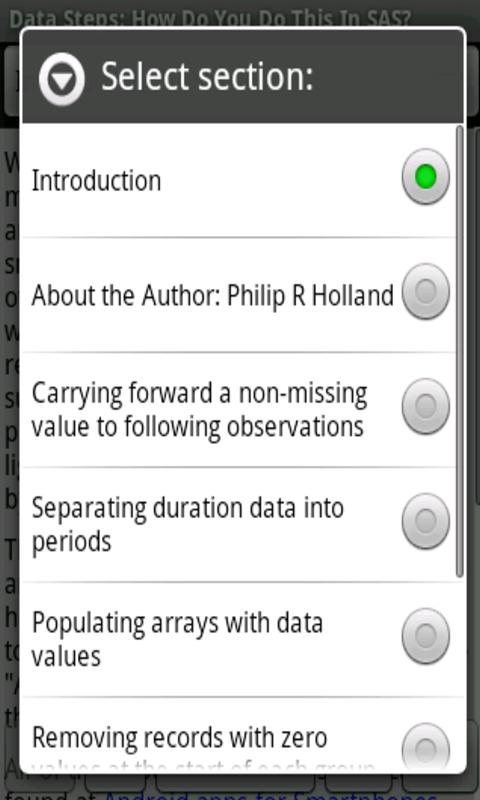 This app, "Data Steps: How Do You Do This in SAS?", is one of a series of eBooks about SAS software programming focusing on frequently asked questions and answers, illustrated by code samples which can be sent by email directly from the app. It is designed to encourage users to contribute questions some of which will be included in future versions of the app. There are controls to select specific questions, move to the previous or next question, decrease or increase the font to suit the user's preference, and send emails requesting answers to questions not yet included in that version of the eBook.