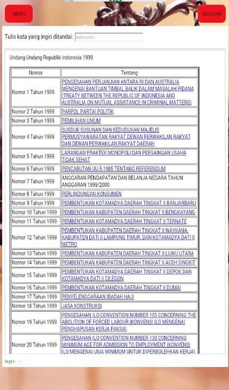 1. Search: cari kata kunci ke semua UU, akan menampilkan pasal dan ayat yang berhubungan dengan kata kunci yang dicari di setiap UU.