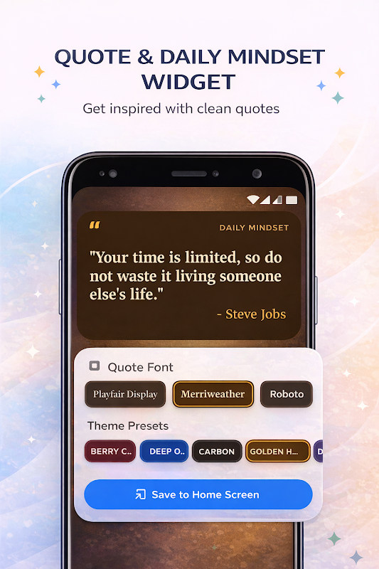 Añade motivación directamente a tu pantalla de inicio con inspiración diaria. Crea citas personalizadas o usa mensajes de mentalidad integrados para mantenerte concentrado.